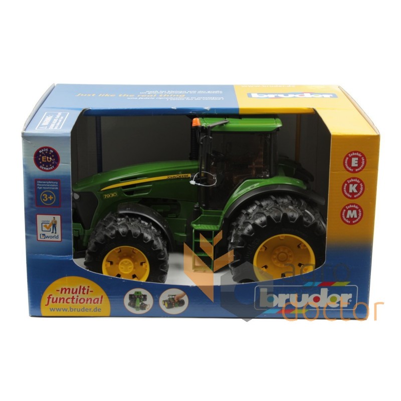 Модель изготовлена из металла и высококачественного пластика. У трактора резиновые колеса с профильными шинами, активная подвеска опускается и поднимается с помощью болтов. Управление мини-копией трактора осуществляется рулем через отверстие в крыше капота. В данной модели открываются боковые двери для посадки фигурки водителя, регулируются зеркала заднего вида и поднимается капот. Передняя часть оборудована специальным креплением для лебедки. К мини-копии трактора John Deere 7930 с двойными колесами можно установить дополнительную прицепную технику бренда Bruder.