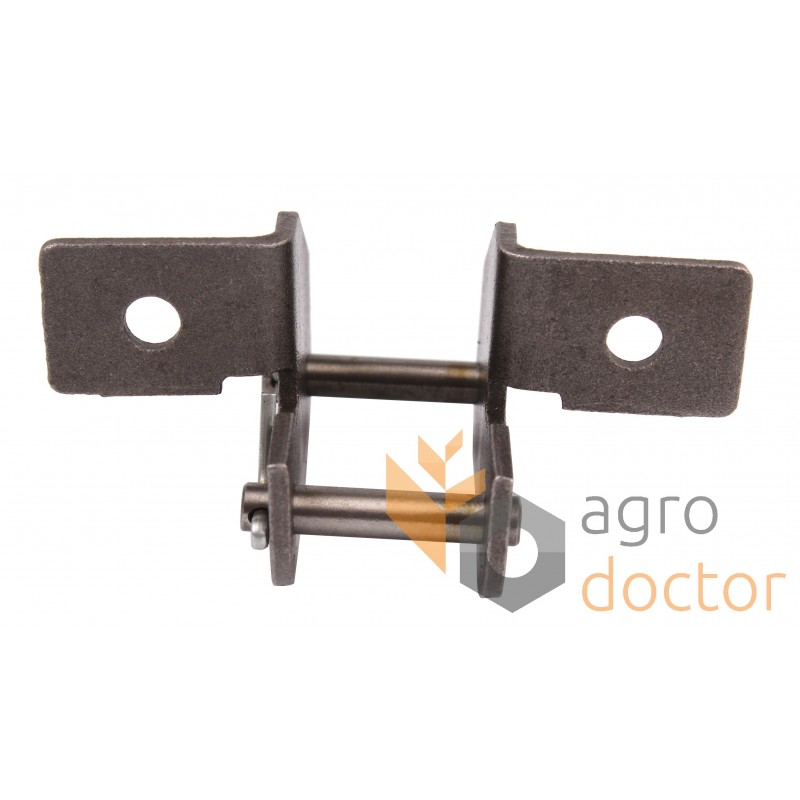 Звено соединительное с креплением служит для соединения отрезков транспортерной роликовой цепи, состоящих из нечетного количества звеньев в случае когда в этом месте есть необходимость в установке элементов элеватора либо транспортера (скребков, направляющих планок).