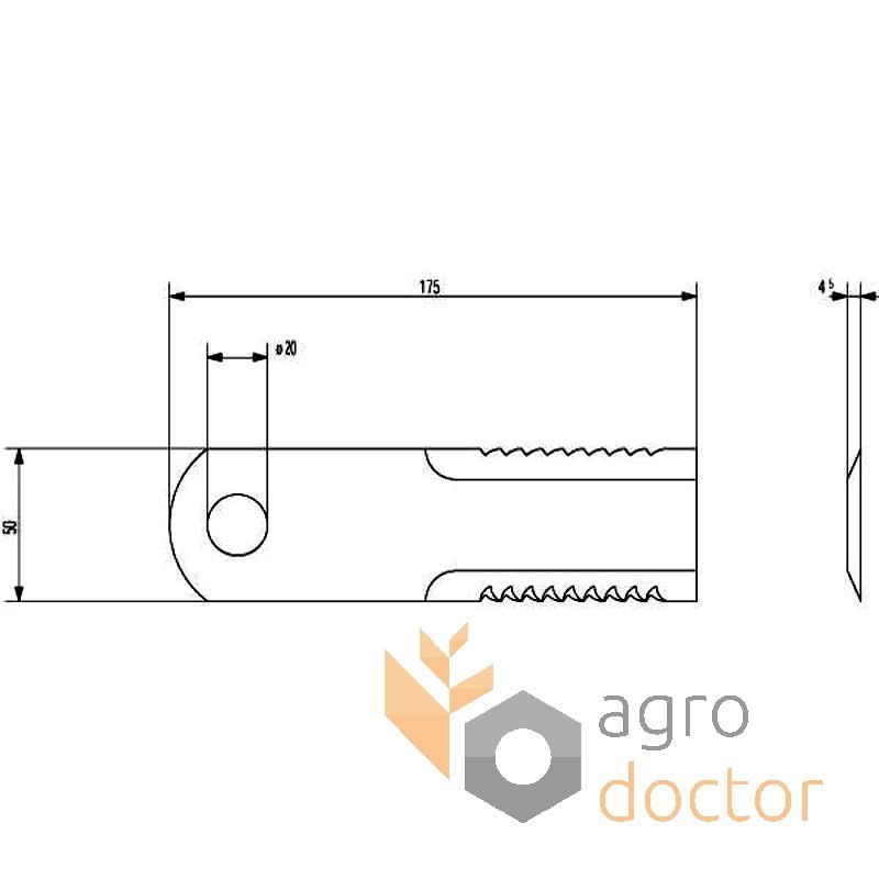Нож измельчителя зерноуборочных комбайнов New Holland TC. Размеры в мм: Длина - 175 Диаметр отверстий крепления - 20.1 Толщина - 4.5. Каталожные номера: 84068444, HF44443. Аналог.