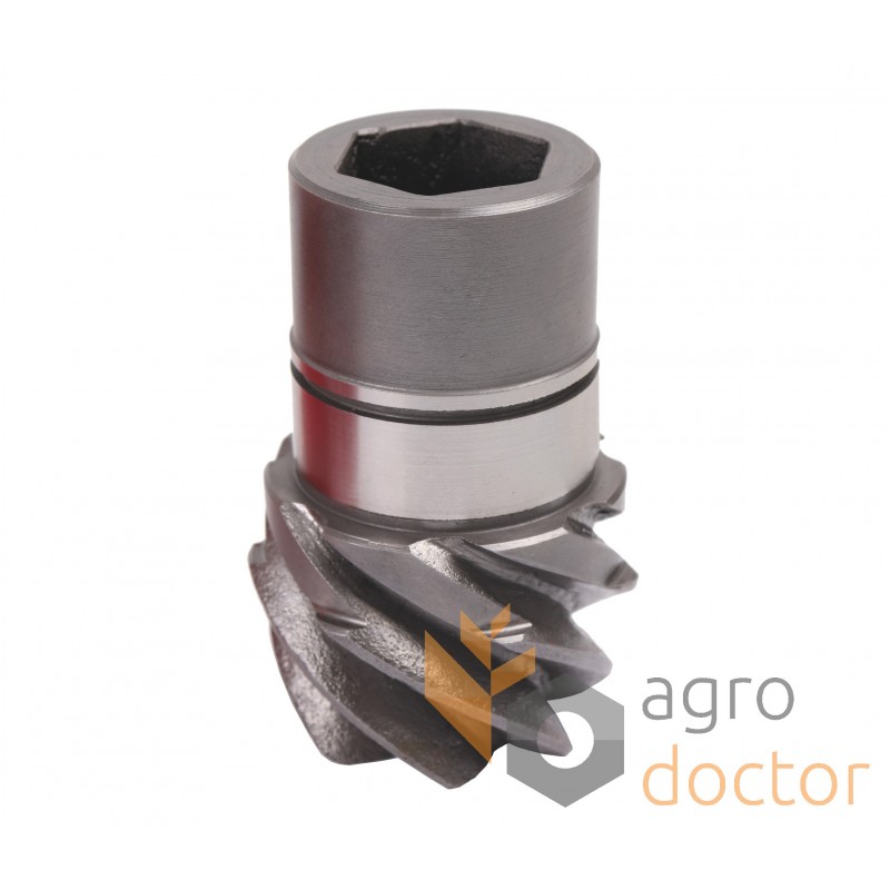 Стальной узел сложной пространственной формы, состоящий из вала-шестерни (коническая, кривозубая) и шестерни с корпусом с аналогичными по форме зубами. Для соединения с приводом в вале выполнено шестигранное отверстие. Детали изготавливаются из специальной стали и термически обработаны с целью повышения прочности и износостойкости.