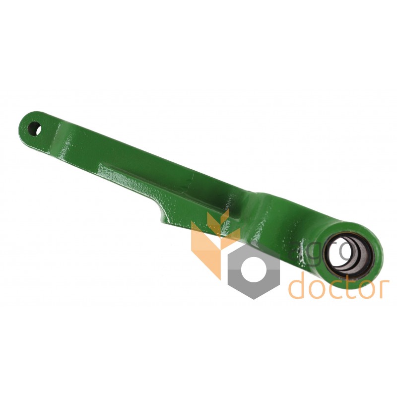 Рычаг натяжителя ремня привода механизмов жатки комбайнов John Deere. Длина - 400 мм., ширина - 140 мм., диаметр крепежного отверстия - 17/26 мм.. Каталожные номера: AH201433