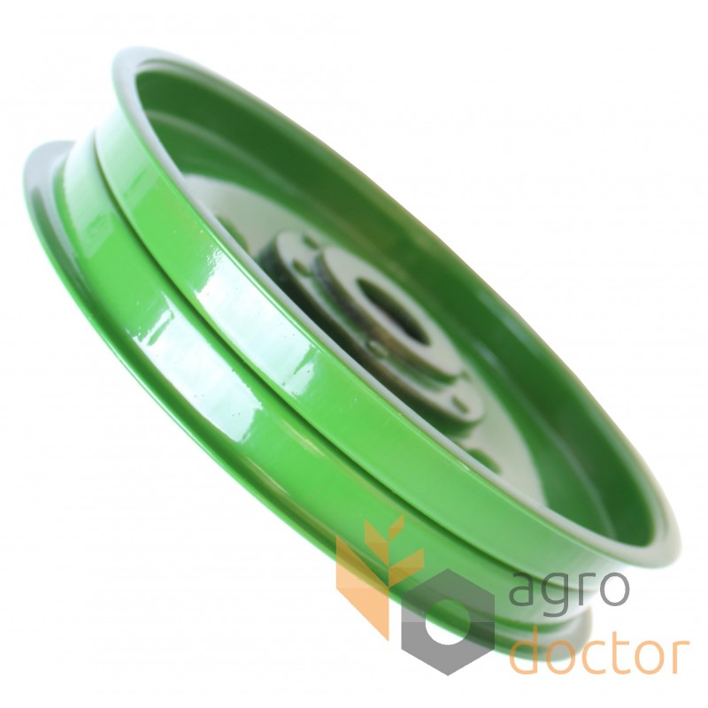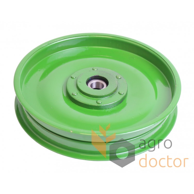 Натяжной ролик привода наклонной камеры зерноуборочных комбайнов John Deere серии 900. Размеры в мм: Внутренний диаметр - 17 Внешний диаметр - 222 . Каталожный номер: AN30569. Аналог.