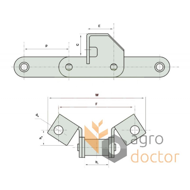 Цепь элеватора представляет собой отрезок длиннозвенной роликовой транспортерной цепи конкретной длины. Часть ее внешних звеньев в определенной последовательности снабжена специальными лапками для крепления рабочих элементов элеватора (скребков, подкладок). Характеризуется общим количеством звеньев, шагом и порядком чередования звеньев с креплением.
