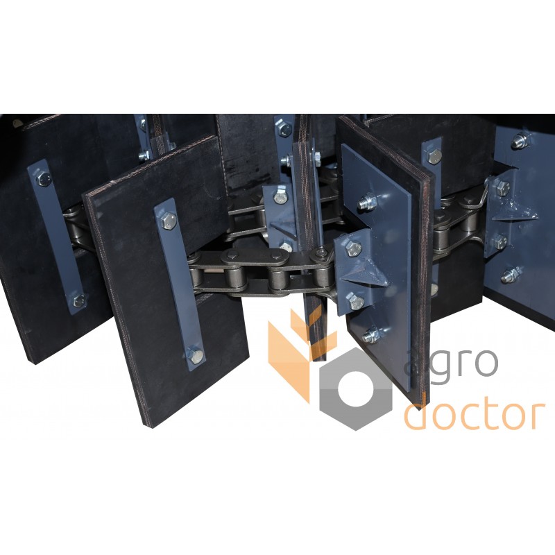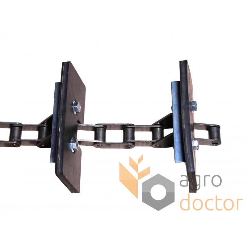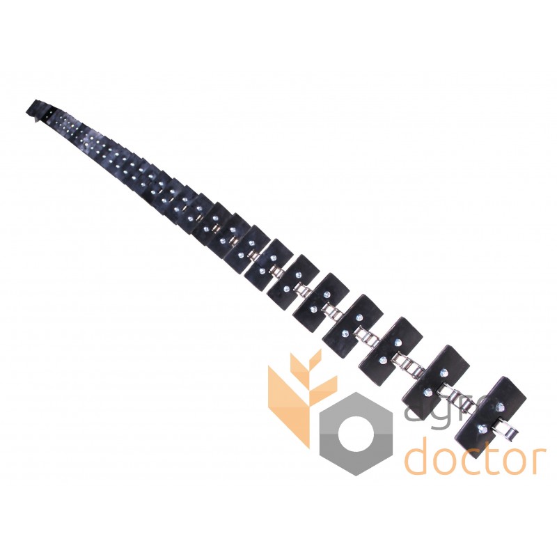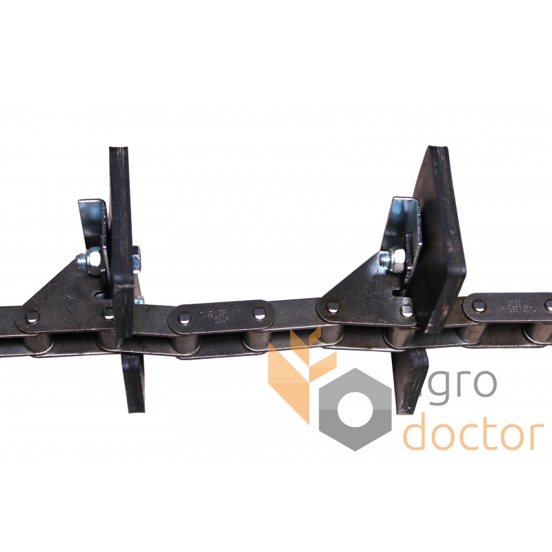Цепь элеватора представляет собой отрезок длиннозвенной роликовой транспортерной цепи конкретной длины. Часть ее внешних звеньев в определенной последовательности снабжена специальными лапками для крепления рабочих элементов элеватора (скребков, подкладок).