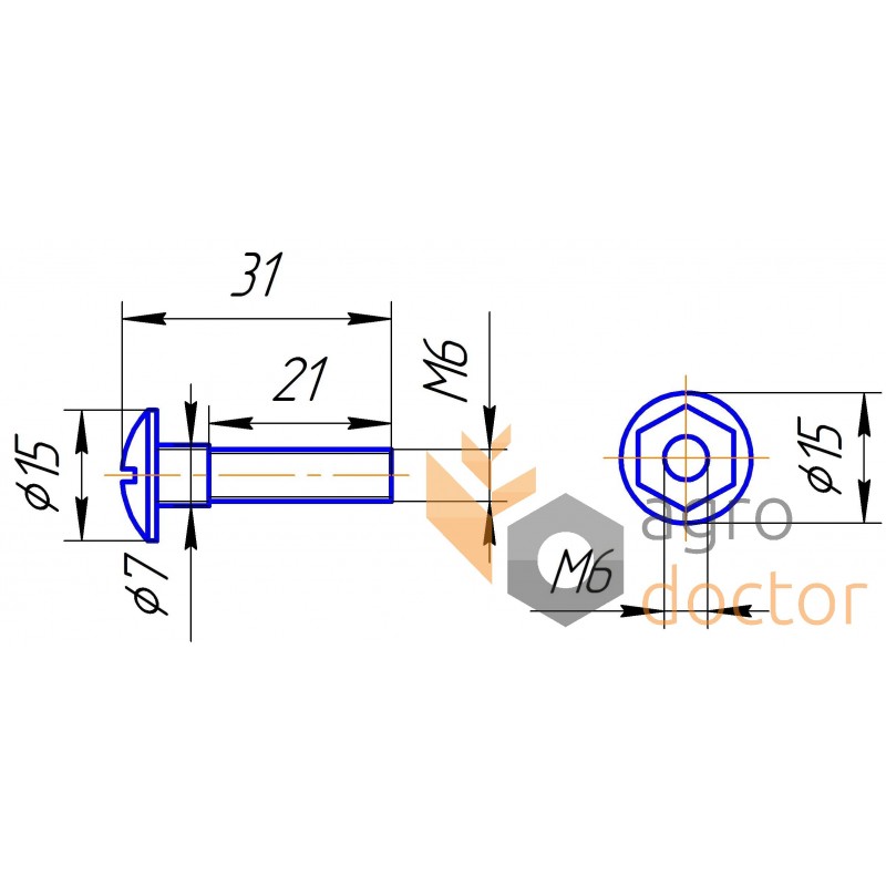 Болт выполнен из стали марки С 10 (С20) по класу прочности 8.8. Головка полукруглая со шлицом под плоскую отвертку, у основания головки на расстояние около 1 см выполнены шлицы для фиксации болта в отверстии, на остальную часть накатана метрическая резьба М6.