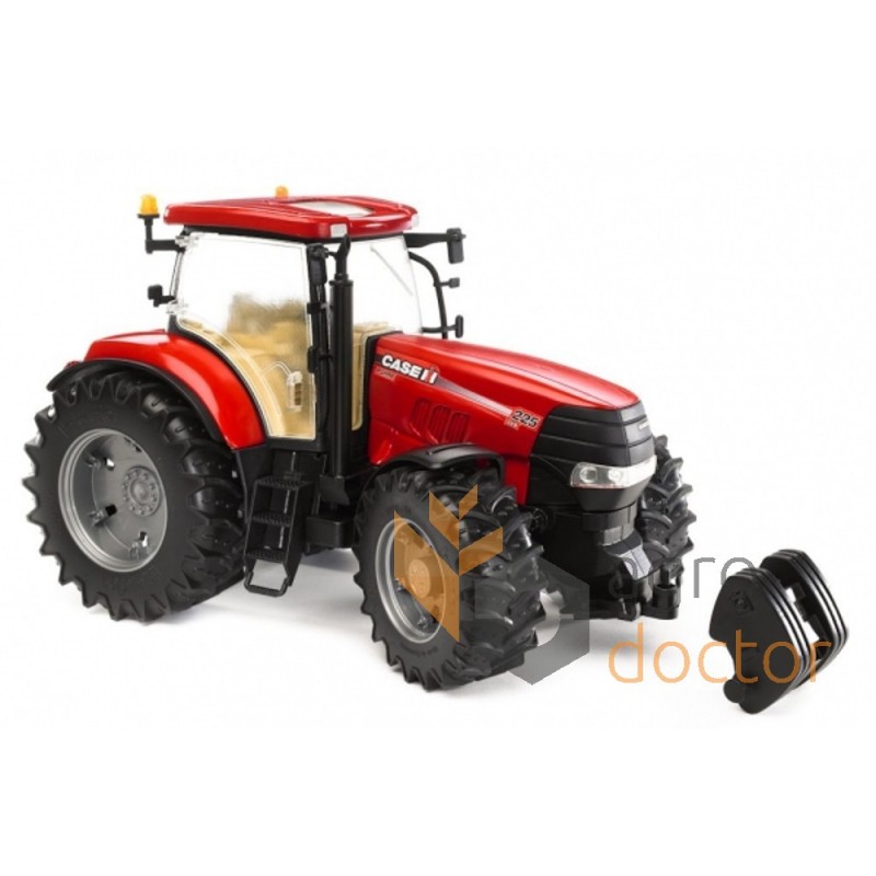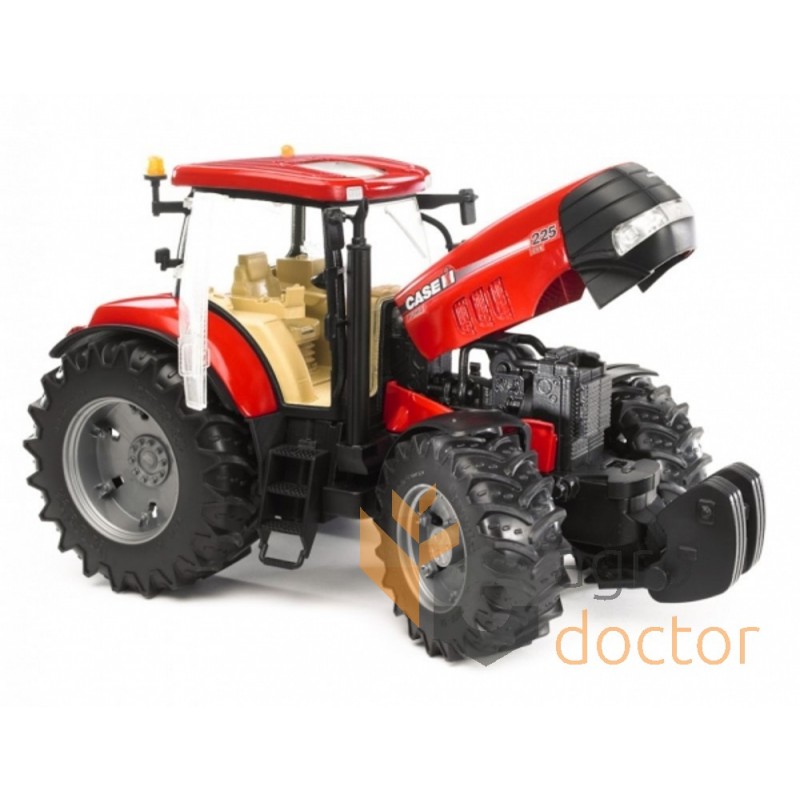 Модель изготовлена из металла и высококачественного пластика. У трактора резиновые колеса с профильными шинами, активная подвеска. Управление мини-копией трактора осуществляется рулем через отверстие в крыше капота. В данной модели открываются боковые двери для посадки фигурки водителя, регулируются зеркала заднего вида и поднимается капот. Передняя часть оборудована специальным креплением для лебедки. К мини-копии трактора Case CVX230 можно установить дополнительную прицепную технику бренда Bruder.