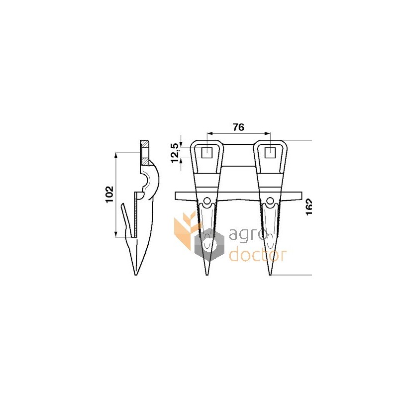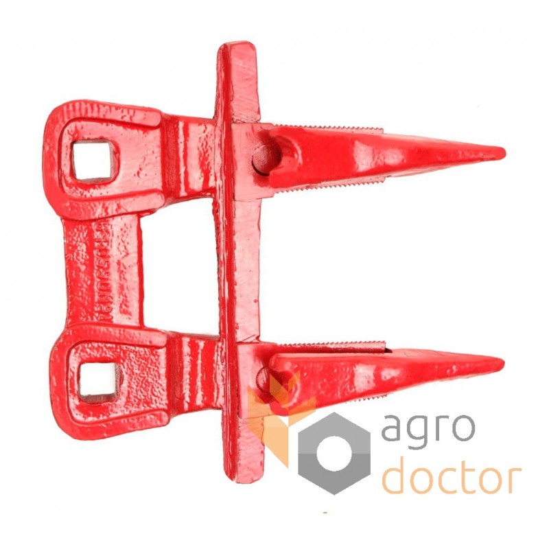 Кованая стальная деталь сложной пространственной формы в виде двузуба. У основания головки выполнены 2 отверстия для крепления к пальцевому брусу.