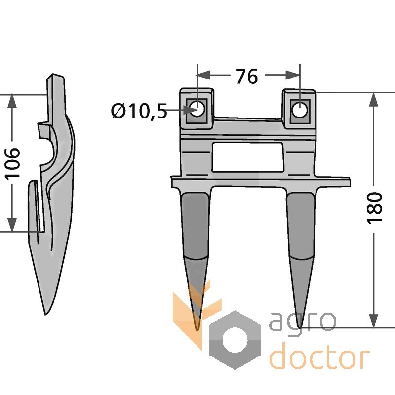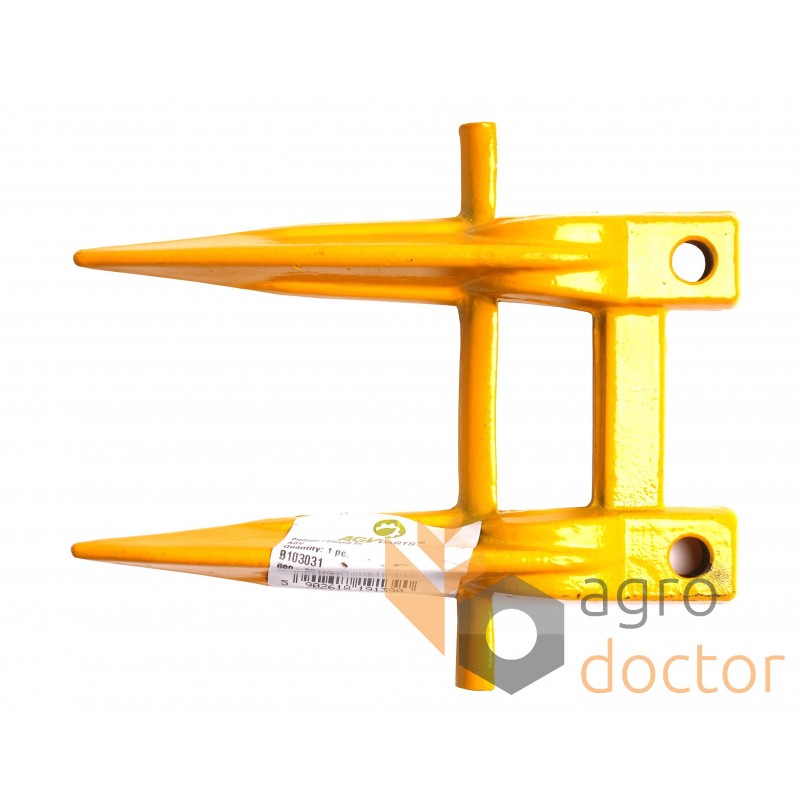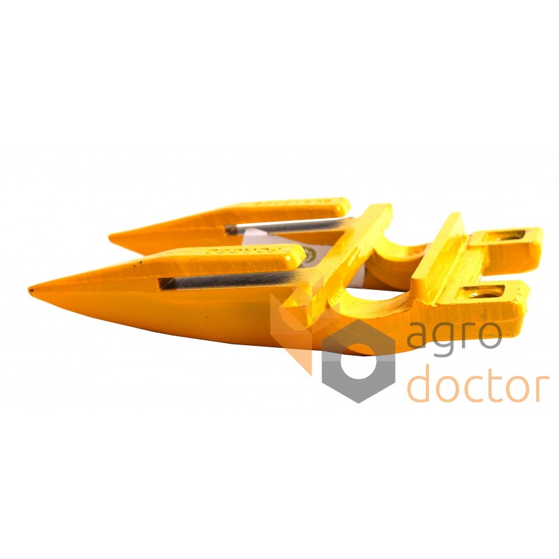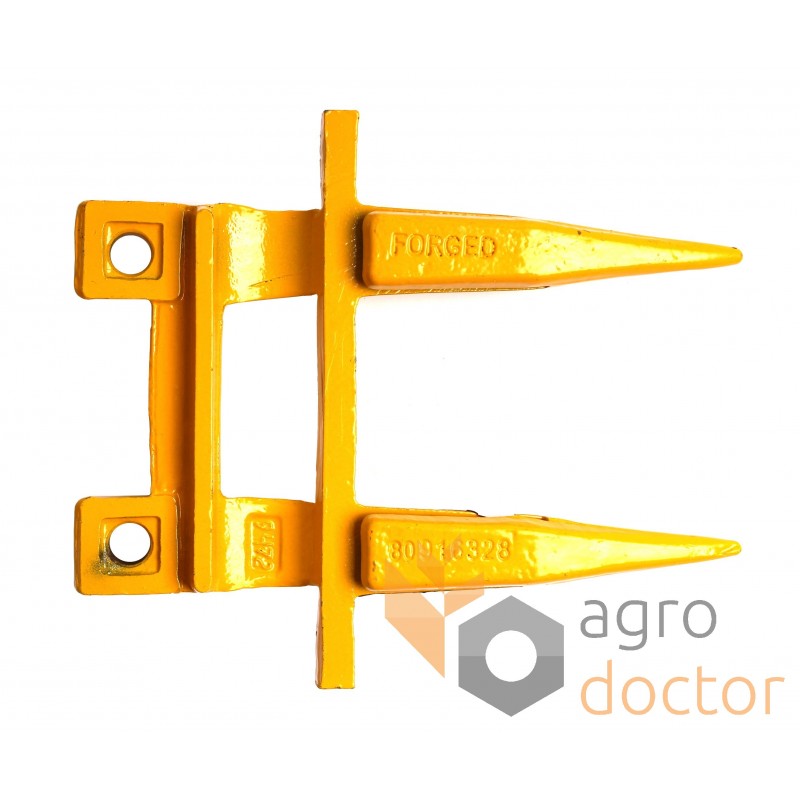 Кованая стальная деталь сложной пространственной формы в виде двузуба. У основания головки выполнены отверстия для крепления к пальцевому брусу.