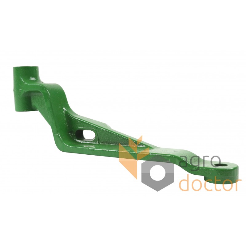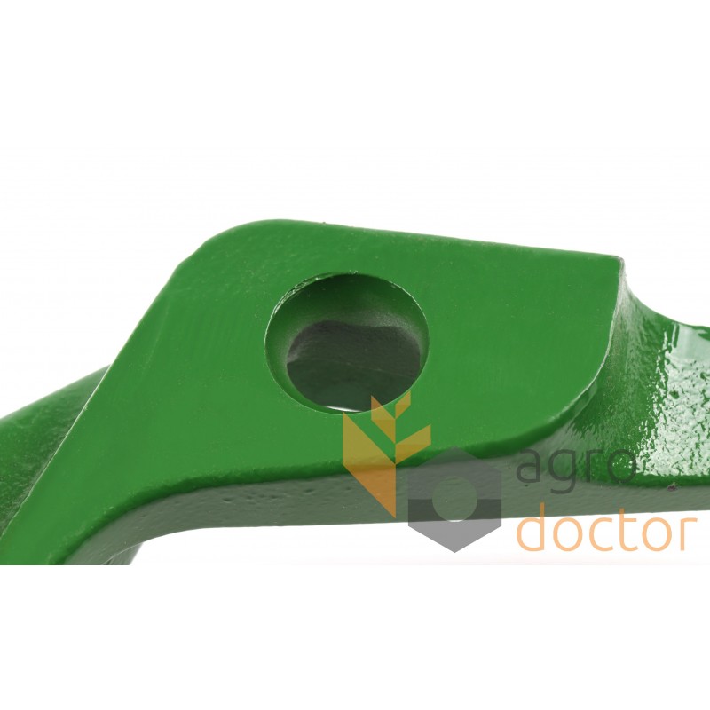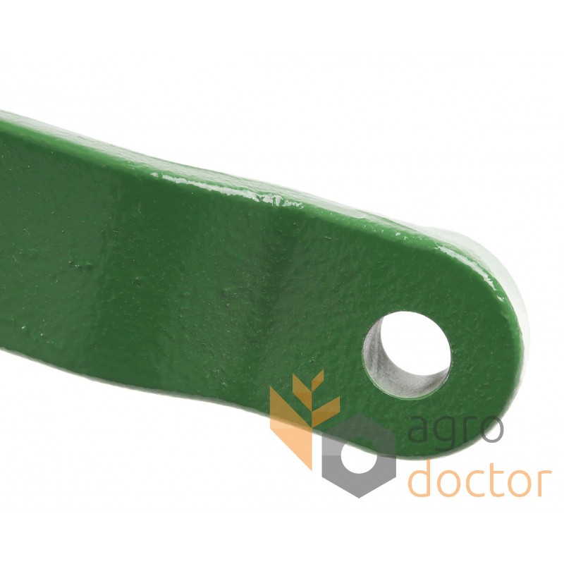 Рычаг натяжителя ремня привода механизмов жатки комбайнов John Deere. Длина - 400 мм., ширина - 140 мм., диаметр крепежного отверстия - 17/26 мм.. Каталожные номера: AH201433