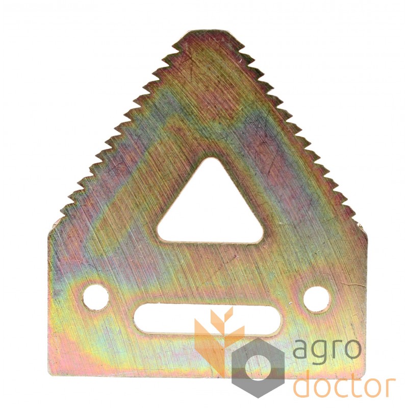 Нож режущего узла жатки John Deere 600, 900 серий. Размеры в мм: Длина - 82.5 Ширина - 76 Диаметр отверстий крепления - 6 Толщина - 3. Каталожные номера: H207930. Аналог.