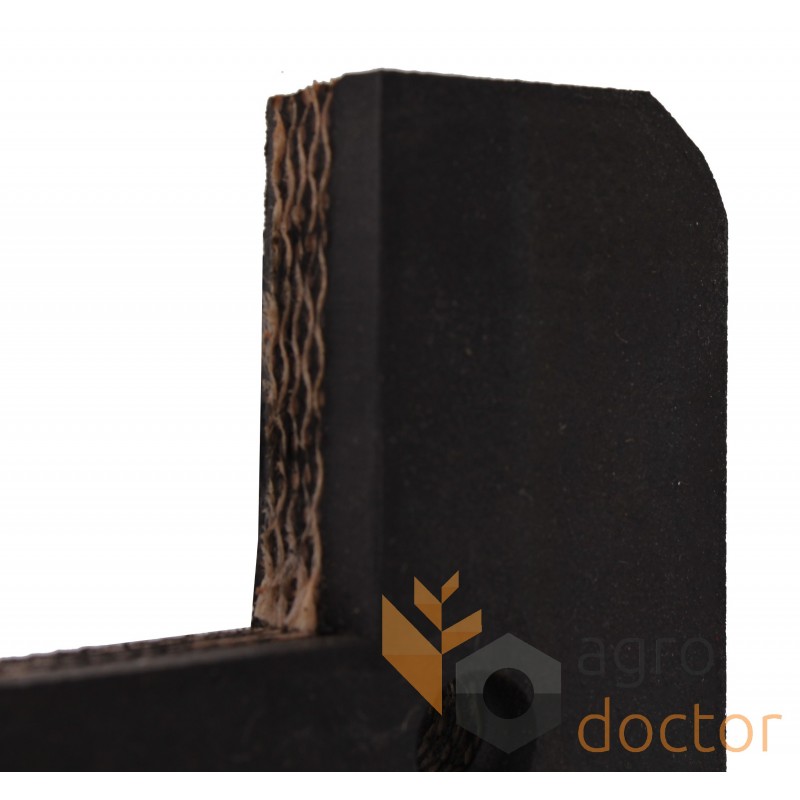 Резиновое изделие из транспортерной ленты в виде прямоугольной пластины с крепежными отверстиями и просечкой под звено элеваторной цепи.