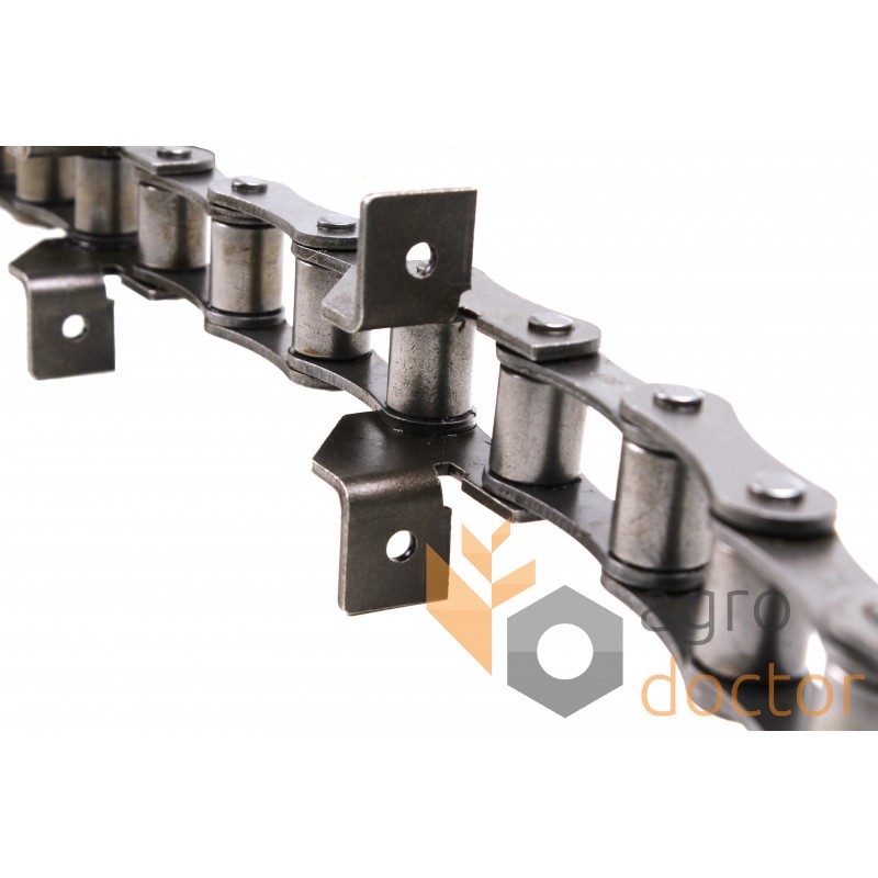 Цепь транспортерная S55V/SD/J2A роликовая длиннозвенная состоит из специальных звеньев с лапками, предназначенных для крепления рабочих органов (скребков, планок, гребенок и т.д.), чередующихся в заданной последовательности со звеньями приводных роликовых длиннозвенных цепей.