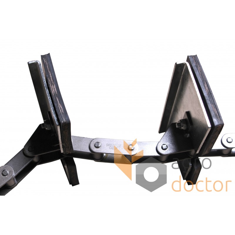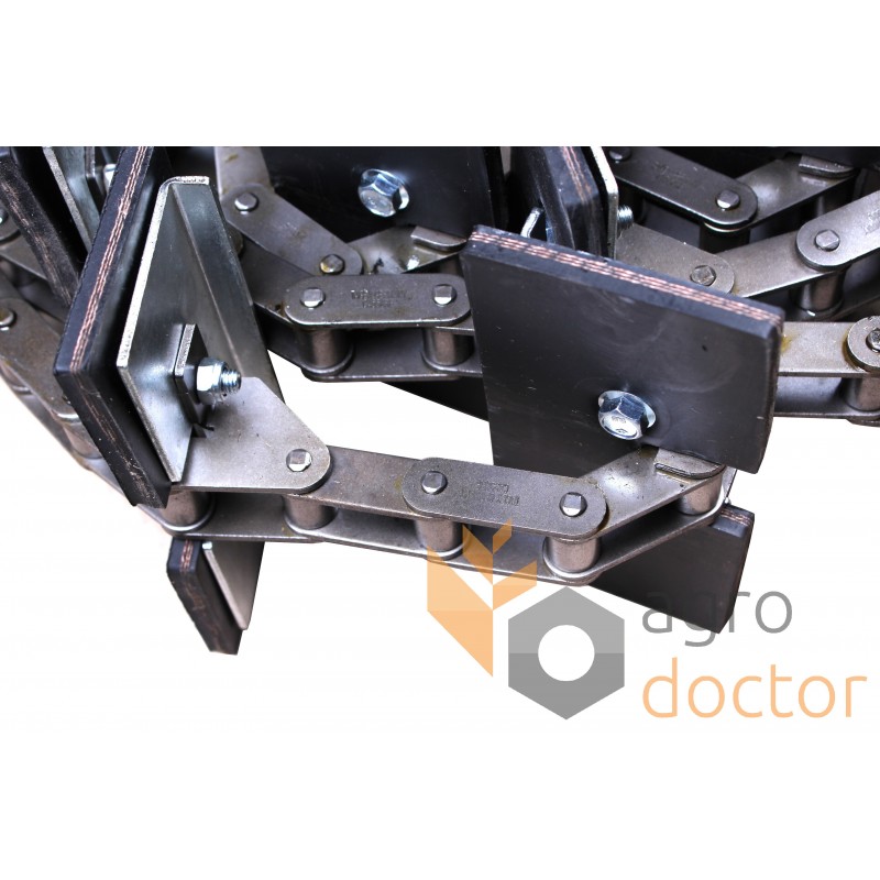 Сборочное изделие, состоящее из роликовой цепи, часть внешних звеньев которого оборудована специальными лапками в определенной последовательности с отверстиями на которых закреплены скребки, изготовленные из специальной транспортерной резины и подкладки к ним.