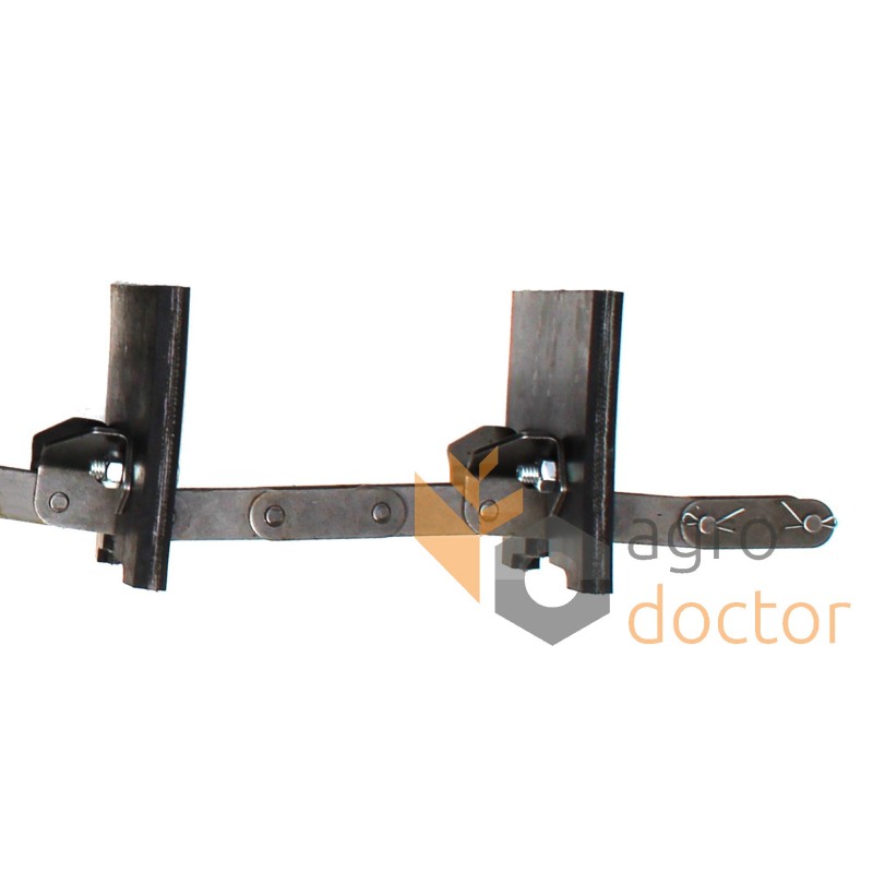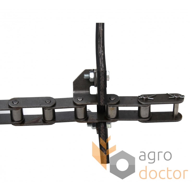 Сборочная единица в виде роликовой цепи со специальными звеньями, на которые устанавливаются прямоугольные скребки изготовлены из транспортерной резины. При движении элеватора происходит подхват зерновой массы и перемещения ее в бункер.