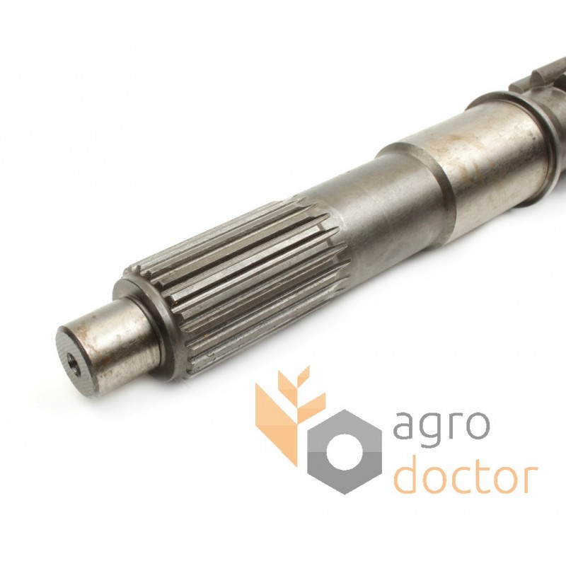 Стальная деталь сложной пространственной формы в виде вала, у которого нарезаны зубъя шестерни, выполнены шлицы и шпоночный паз для крепления шестерен КПП. Деталь изготовлена из специальной стали и термически обработана, что обеспечивает максимальную твердость и износостойкость.