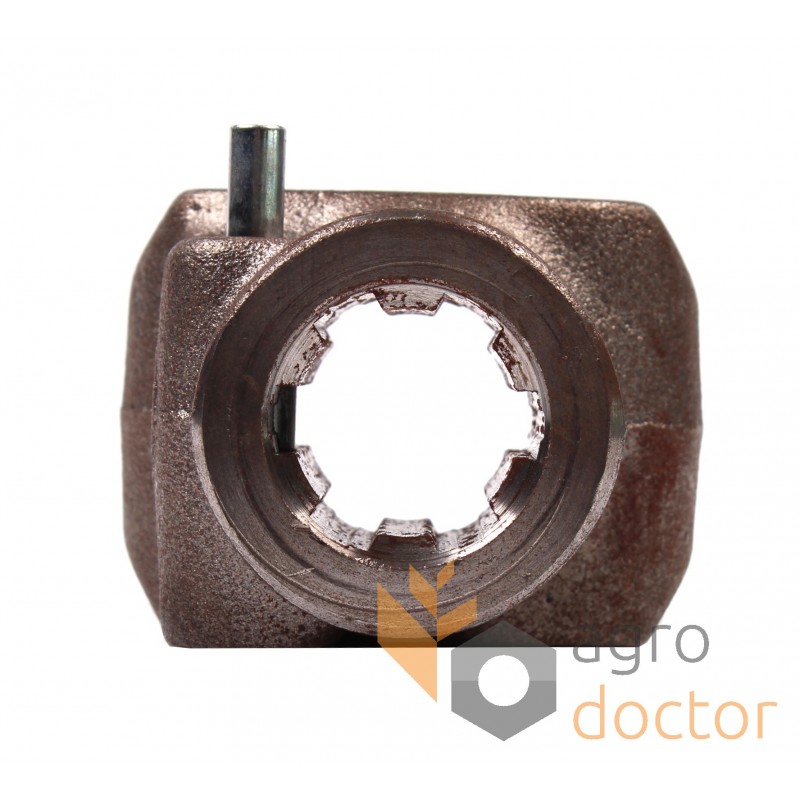 Металлическая деталь сложной пространственной формы в виде вилки и вала вылитой как одно целое. Для крепления крестовины в вилке выполнены специальные отверстия и отверстие соответствующей формы в вале для соединения с механизмами. Деталь изготовлена из специальной стали для максимальной прочности и износостойкости.