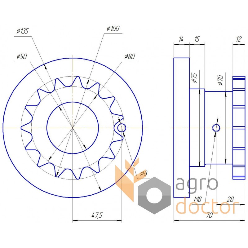 Звездочка z15 выгрузного устройства зерноуборочных комбайнов Claas Lexion, Tucano, Medion, Dominator, Mega. Посадка на вал диаметром 50 мм. Каталожный номер 0007349861.